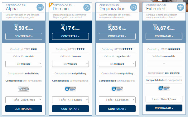 Actualmente existen distintos certificados digitales de pago en cada proveedor. Por ejemplo, en Host Europe tienes distintos certificados.
