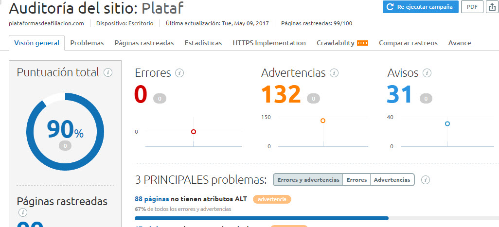 Si dispones de la versión de pago de Semrush puedes hacer una auditoría para detectar errores. Para ello simplemente tienes que añadir un nuevo Proyecto y hacer un «Site Audit» sobre unos 100 resultados, que es más que suficiente para detectar si ha habido fallos de contenido mixto duplicado.